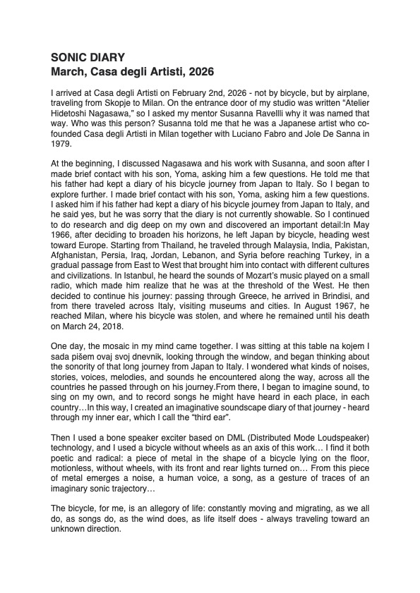 The "Emergency Exit" project represents a contemporary response to classical artistic concepts, exploring them through a combination of performance, video, and artwork maintenance. This work simultaneously sheds light on current social and political themes, raising questions about freedom, boundaries, and presence in today's world. In this vision, the Serbian Pavilion becomes an open, fluid space where the roles of artists, curators, and the audience are connected through a sonic dimension that unites all participants beyond the dominant visual representation regime. The performative impulse of the soundscape influences all visitors to emotionally engage in the creation of the artistic experience, opposing passive observation of the exhibited work. This concept of setting up soundscapes that allow emotional connection throughout the duration of the Biennale enables the Pavilion to constantly evolve through the interactions with each visitor's affective engagement, beyond the usual intellectual and aesthetic act of observation. Each visit offers an opportunity for emotional exchange, as the key idea is the Pavilion's openness to everyone and making everyone feel welcome.